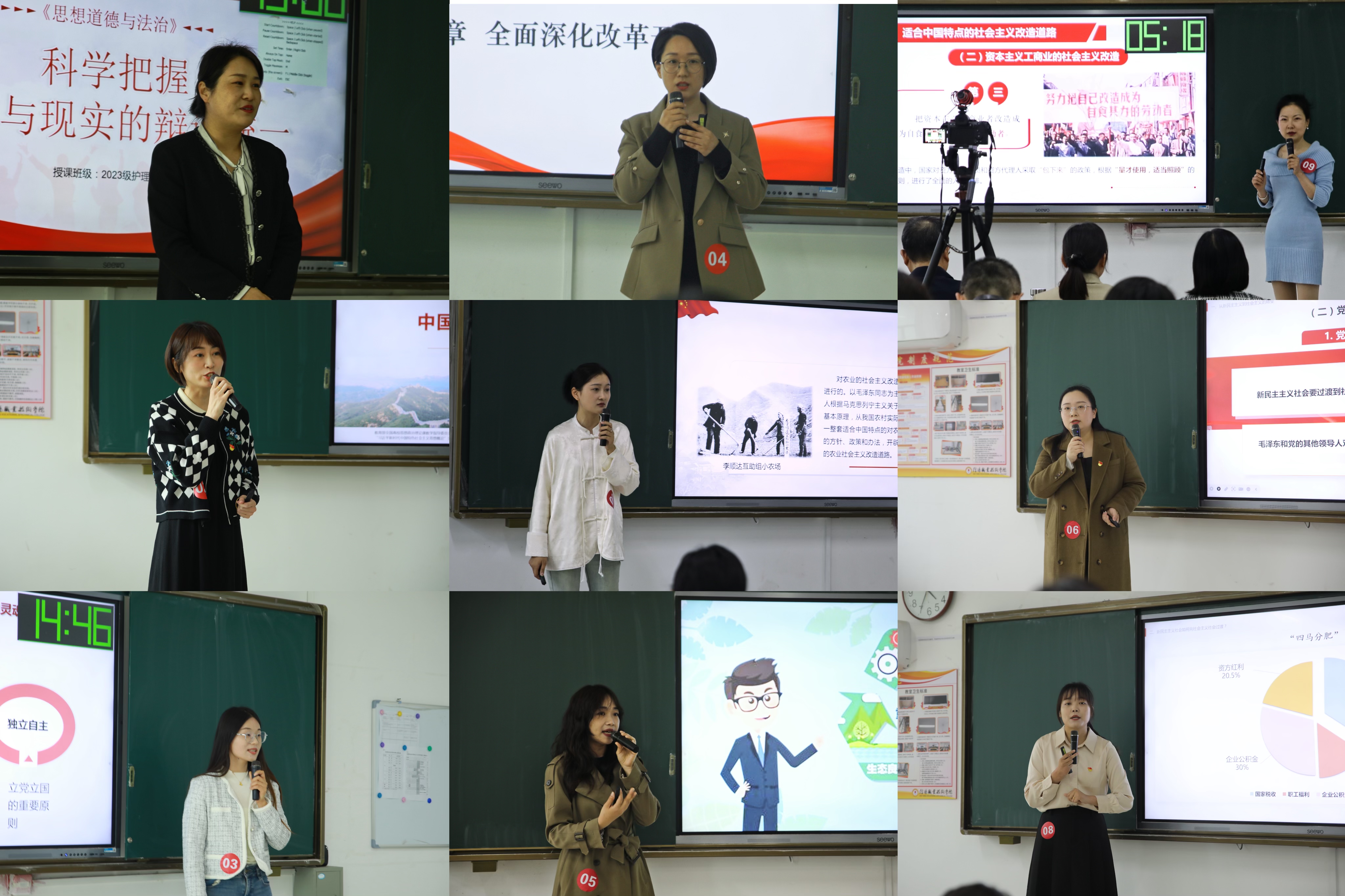 活动环节,经过3044永利集团初赛遴选出的9名选手,围绕《习近平新时代中国特色社会主义思想概论》《毛泽东思想和中国特色社会主义理论体系概论》《思想道德与法治》《形势与政策》四门课程,按照抽签的先后顺序,结合PPT,进行了15分钟的现场无生教学展示。选手们用饱满的热情、创新的设计、详实的讲解,充分展示出深厚的理论功底和扎实的教学技能。